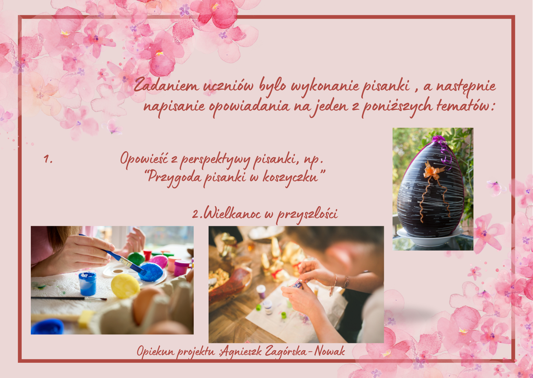 Uczniowie klasy IV zmierzyli się dziś na j.polskim z zadaniem 9. Ogólnopolskiego Projektu Edukacyjnego "Polak ma essę! 3". Najpierw przygotowywali pisanki według własnego projektu , a następnie pisali opowiadania , w których była ona narratorem.