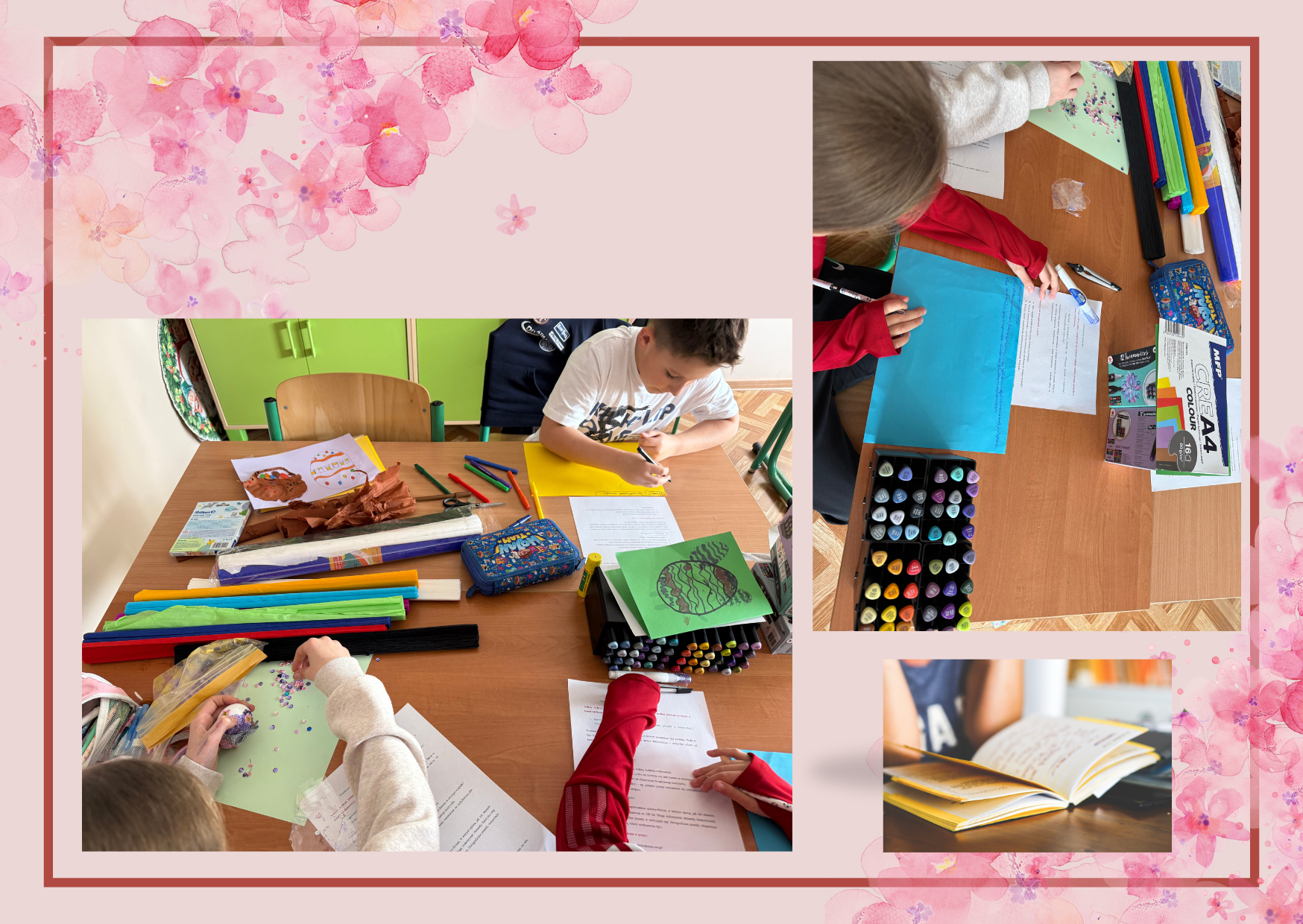 Podczas zajęć świetlicowych dzieci wykonywały kartki wielkanocne według własnych pomysłów, rozwijając wyobraźnię, zdolności manualne oraz poczucie estetyki.