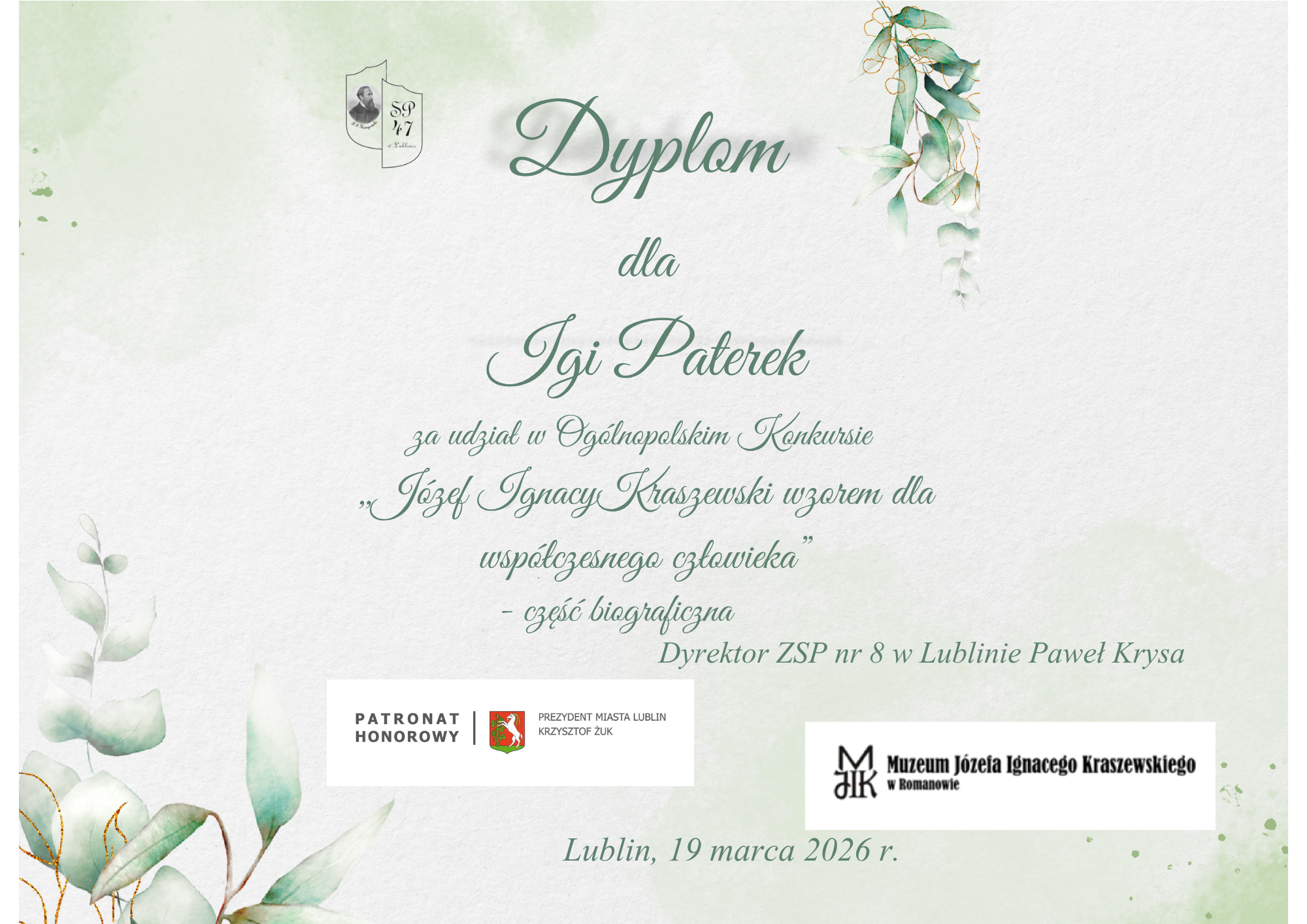 Dnia 12.03. 2026r. nasze uczennice, tj. Ada Jaworska, Agnieszka Osuch, Izabela Duma oraz Iga Paterek brały udział w Ogólnopolskim Konkursie „Józef Ignacy Kraszewski wzorem dla współczesnego człowieka”, nad którym patronaty objęli: Lubelski Kurator Oświaty, Prezydent Miasta Lublin, Dyrektor Muzeum J. I. Kraszewskiego w Romanowie.